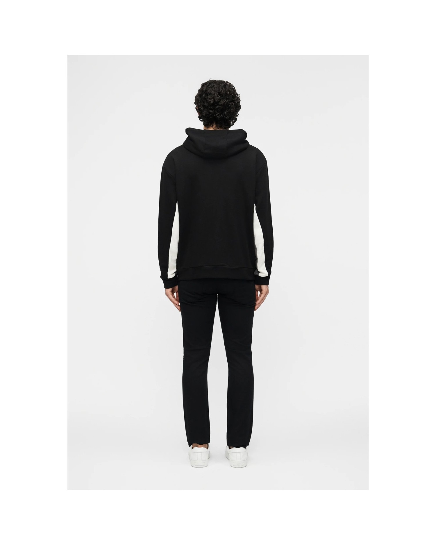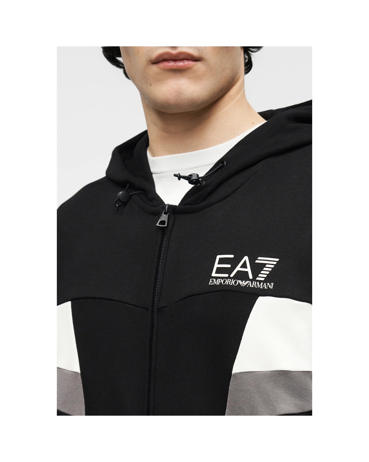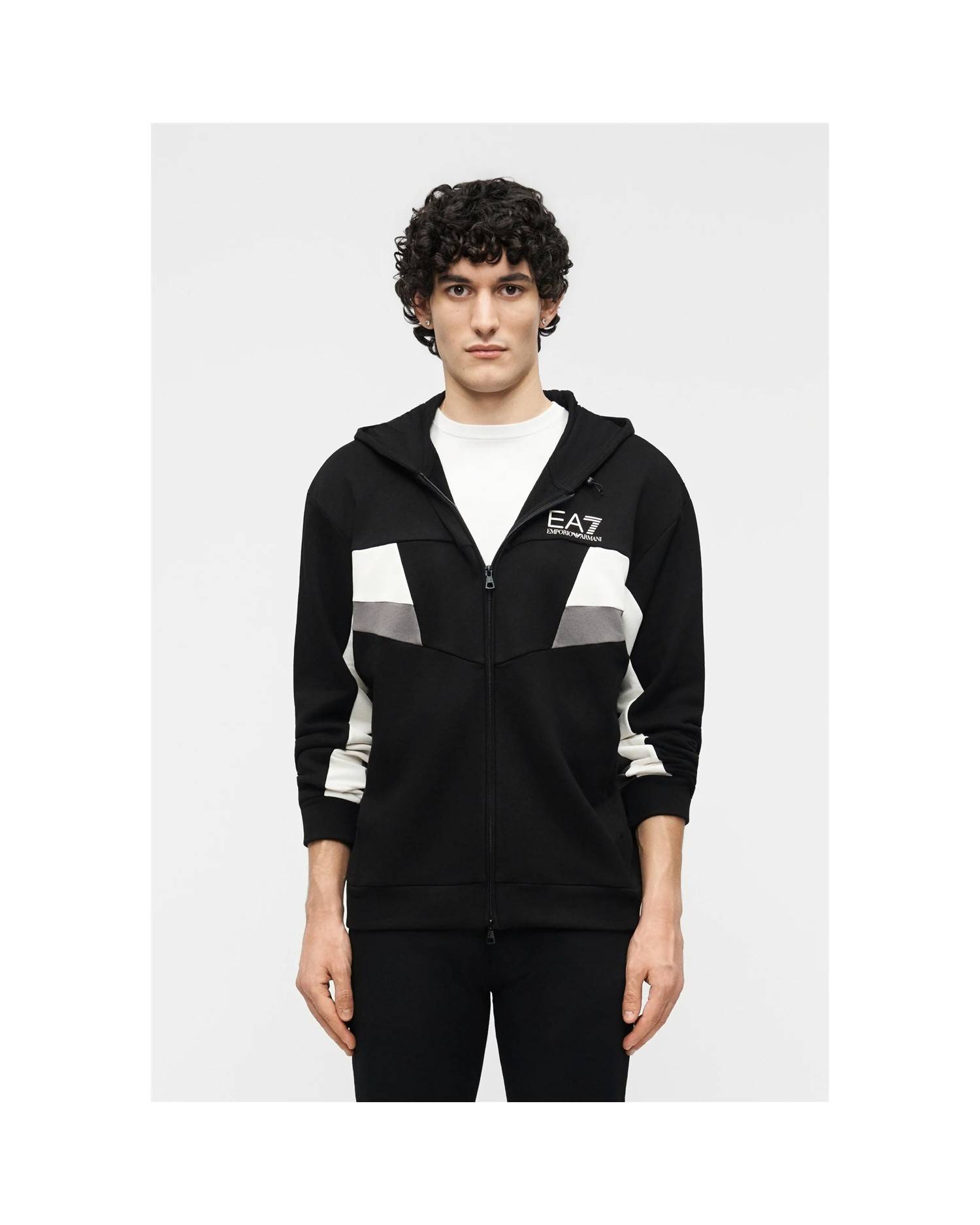 Sudadera con capucha, cierre de cremallera y detalle de bloques de color.